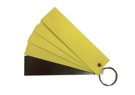 Inclui também calços (shims) de 4 mm x 0,5 mm (0,02”), utilizados para simular condições reais de revestimento e permitir o ajuste preciso dos níveis de sensibilidade do equipamento.