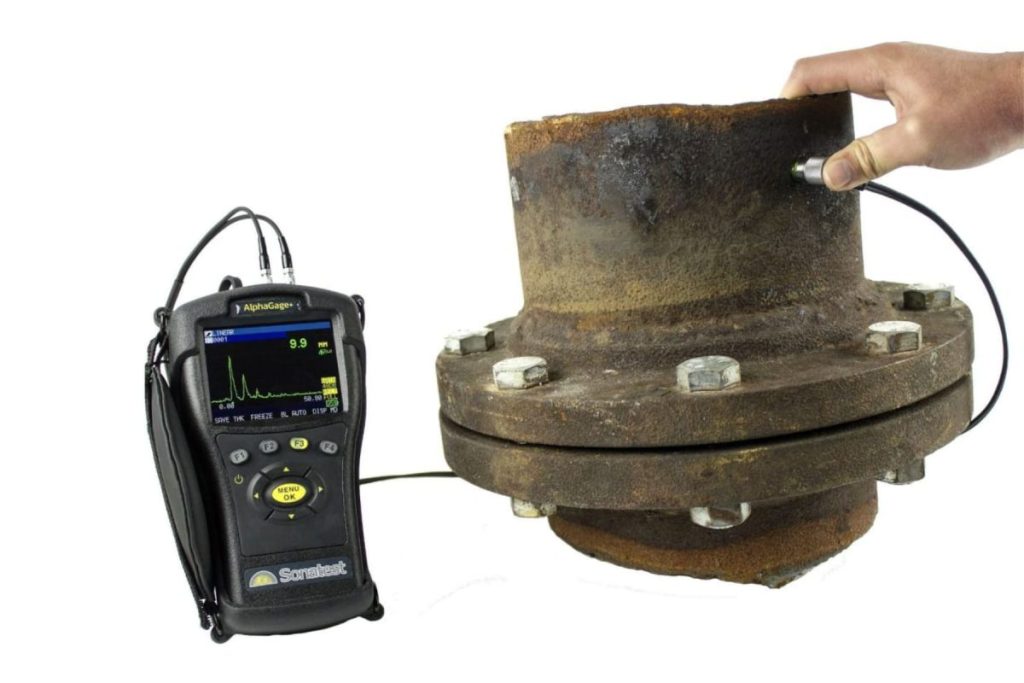 O medidores Alphagage+ C utiliza, em geral, transdutores de elemento duplo em uma configuração Pitch & Catch (emissor e receptor separados) para reduzir interferências na superfície e medir com precisão a espessura remanescente de estruturas metálicas sujeitas à corrosão.