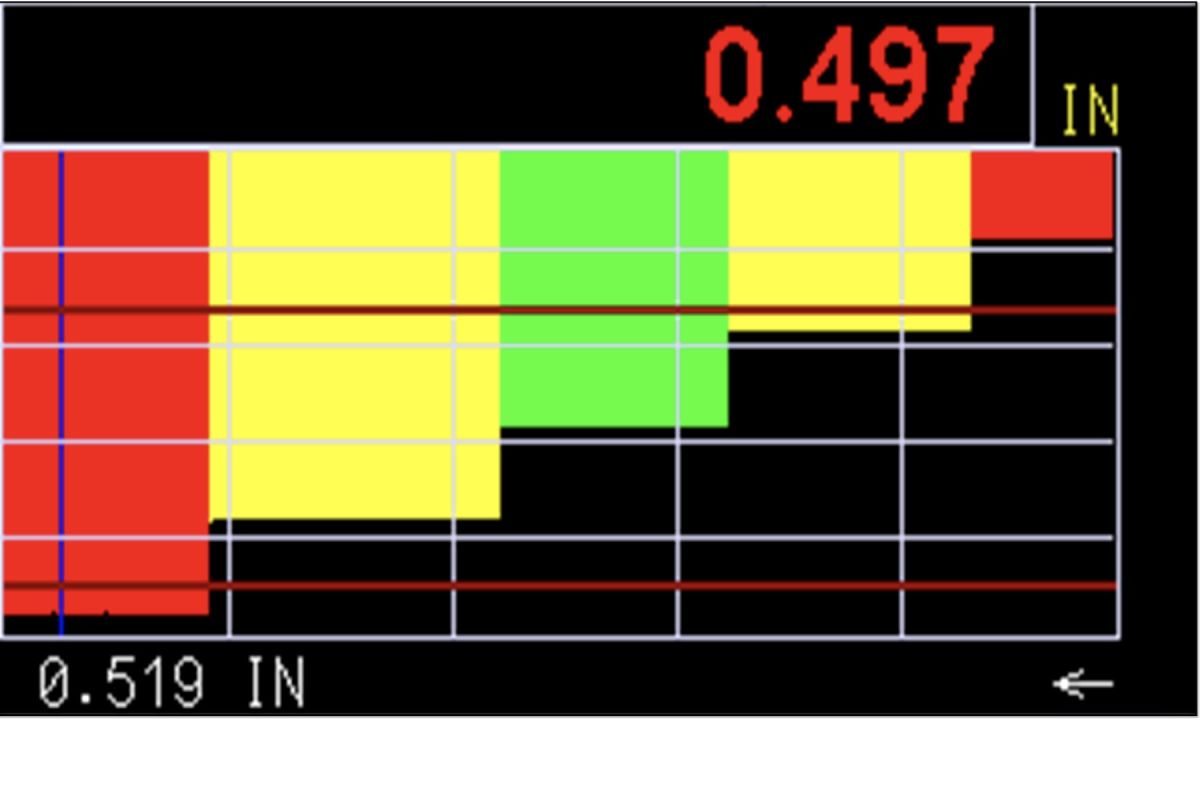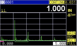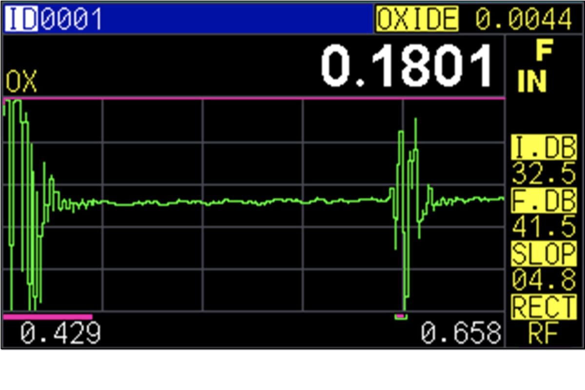 Exibição simultânea da espessura do revestimento e do substrato no visor, com forma de onda em tempo real (live waveform).
